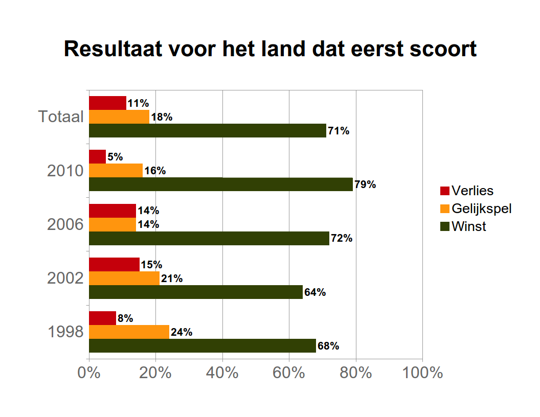 Winnen tegen de Algerijnen is de opdracht, maar hoe pakken de Belgen dat het beste aan? Het antwoord op die vraag ligt voor de hand: door als eerste een doelpunt te scoren. Een land dat in een wedstrijd op voorsprong komt, verhoogt zijn kansen op een overwinning namelijk aanzienlijk. In slechts 21 van de 256 wedstrijden die op de afgelopen vier wereldkampioenschappen gespeeld werden, viel geen enkel doelpunt. Een analyse van de resterende 235 wedstrijden in figuur 1 toont dat maar liefst 71% van de wedstrijden gewonnen werd door het land dat het eerste doelpunt scoorde. Een land dat op achterstand komt, kan die scheve situatie in slechts 11% van de wedstrijden nog ombuigen in een overwinning. Eén vroeg doelpunt tegen Algerije biedt echter geen garanties op de drie punten, maar zou alvast een goed begin zijn. Van de 256 beschouwde wedstrijden eindigden er immers slechts 57 ofwel zo’n 22% op 1-0.